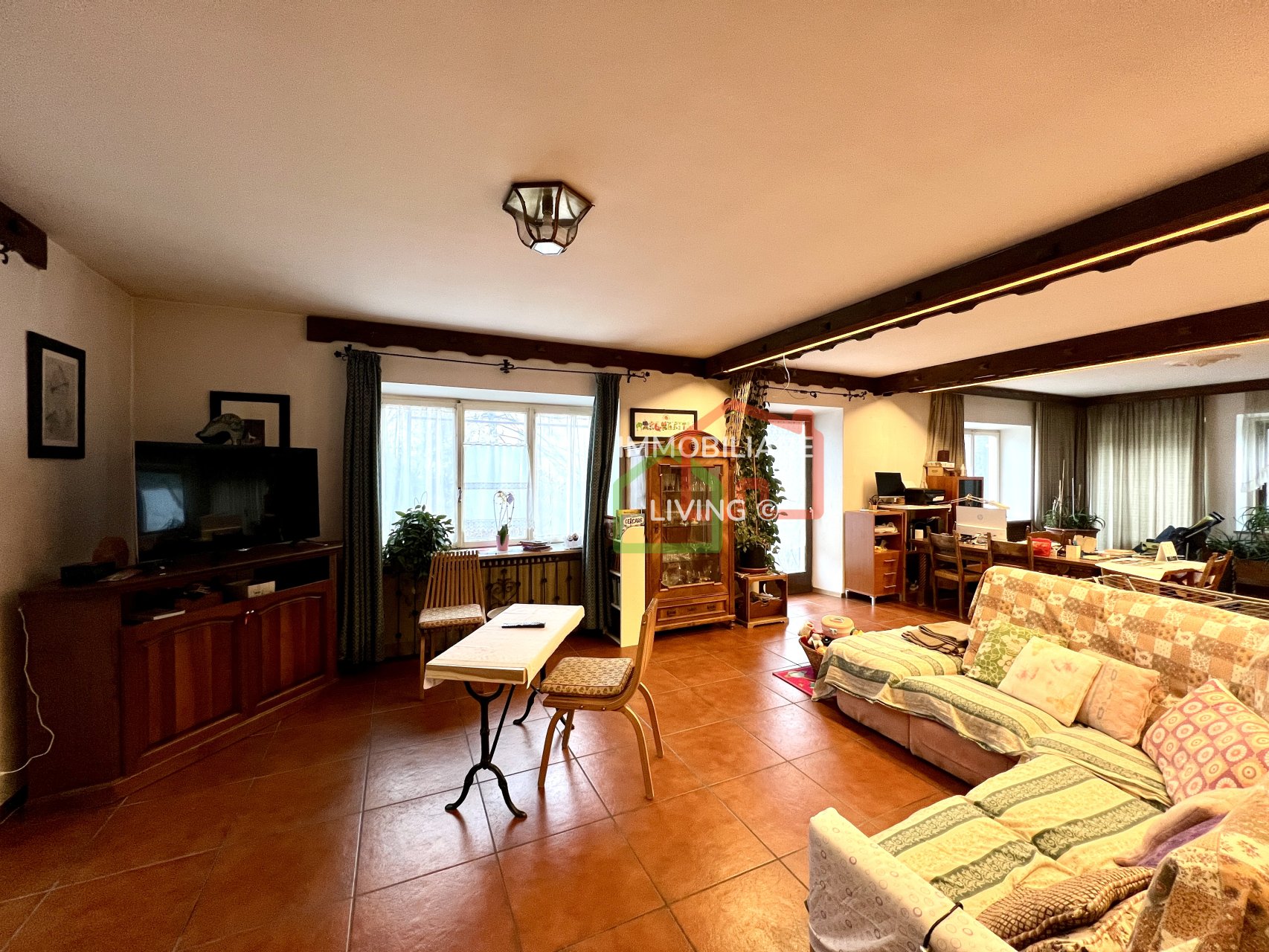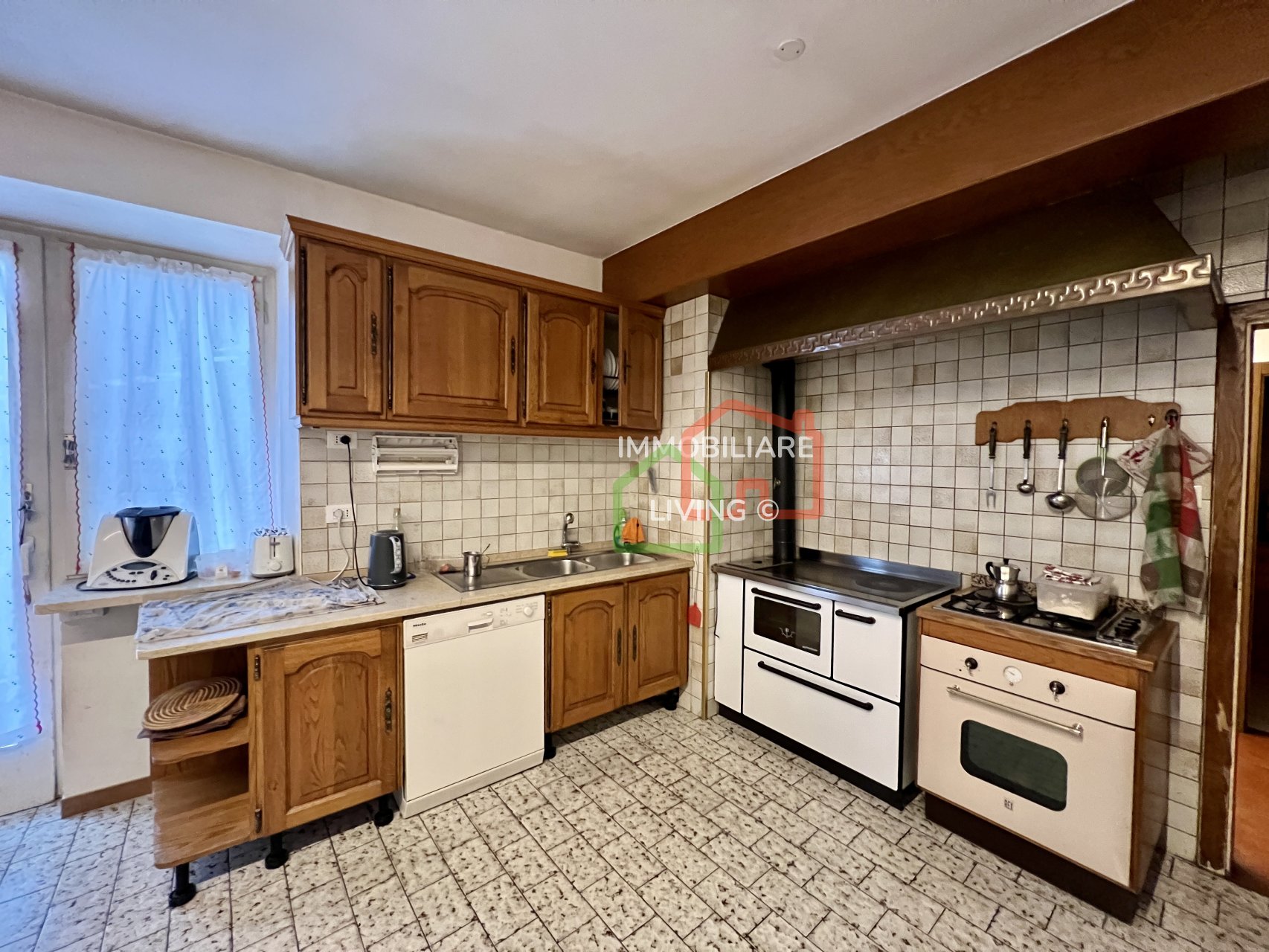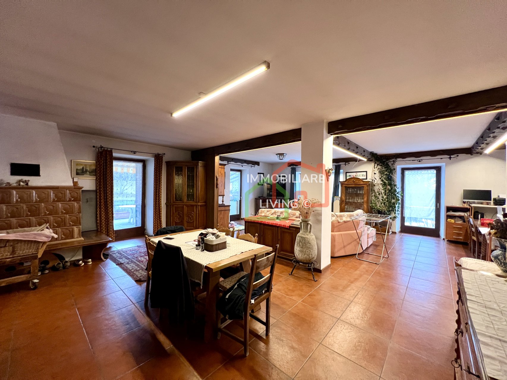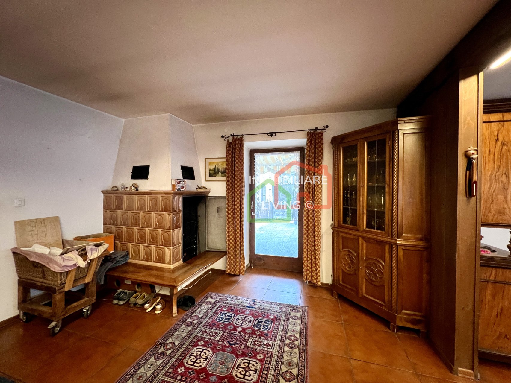 Riscaldamento autonomo con piccola caldaia a pellet e meravigliosa stufa a olle in soggiorno. APE E